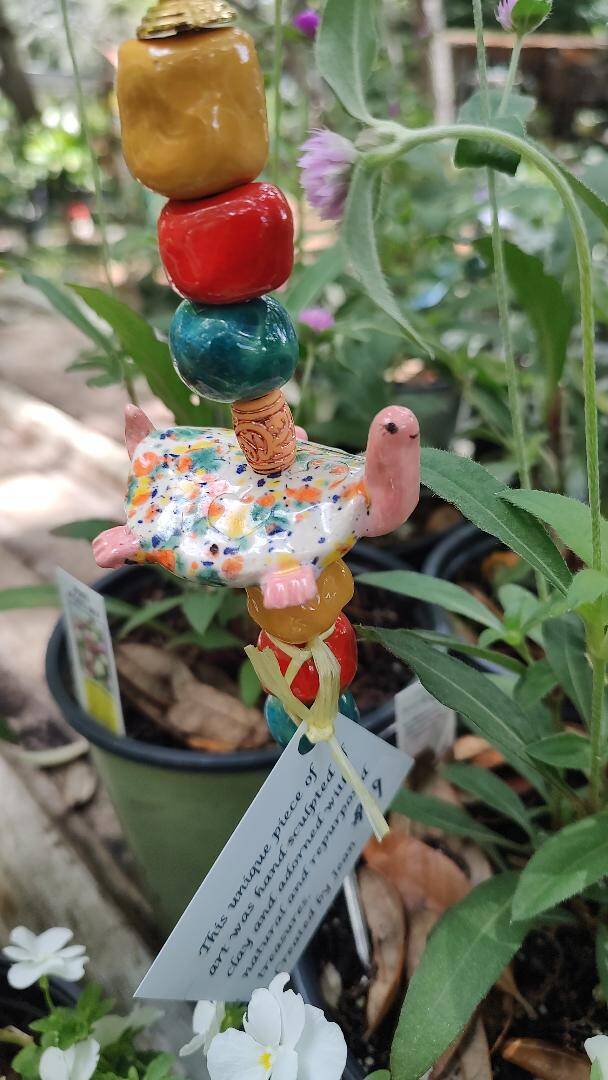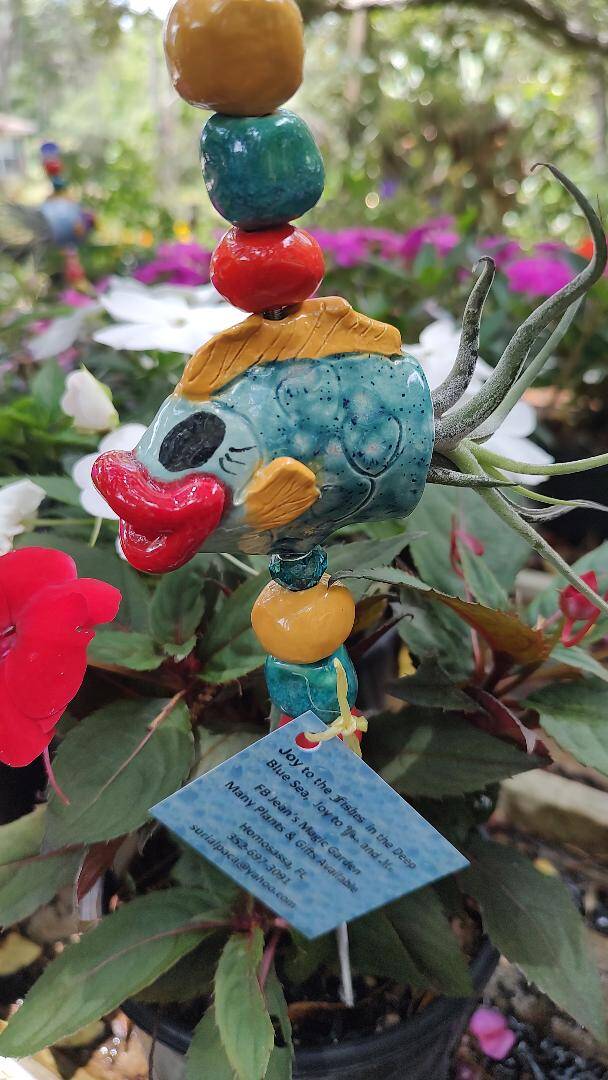 Fish hand sculpted out of clay. They look great in gardens and patios. The fish are about 5 inches long and the mobile from top to bottom is about 18 inches tall. The center picture is a turtle on a plant stake, 18 inches tall.